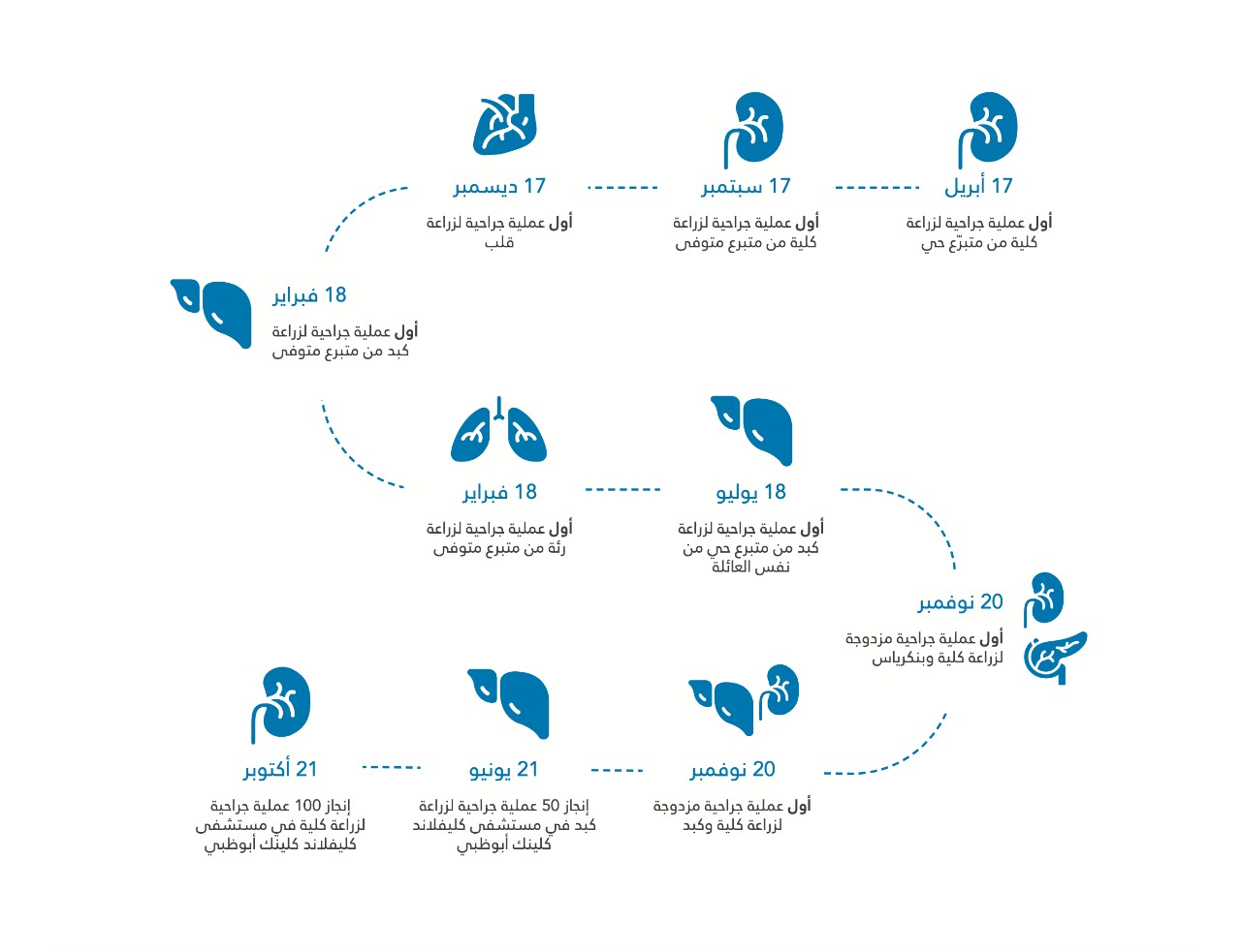كان البرنامج الأول في دولة الإمارات العربية المتحدة الذي يجري عمليات زراعة القلب والكبد والرئة والبنكرياس، وكان الأول في دولة الإمارات العربية المتحدة الذي يجري عمليات زراعة معقدة لأعضاء متعددة. وفي عام 2021، أجرى البرنامج أول عملية زراعة كلى "خاصة" في دولة الإمارات العربية المتحدة، وهي جراحة معقدة قام بإجرائها الجراحون من خلال إعادة زراعة كلية لمريض بعد إزالتها لاستئصال ورم سرطاني.