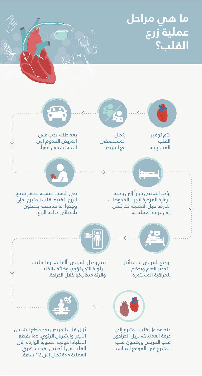 بعد العثور على متبرّع مطابق للمتلقي، تتسارع الخطى نحو نقل قلب المتبرّع وفحصه وتقييم حالته وصولاً إلى المرحلة الأخيرة، ألا وهي زرعه لدى المتلقي الذي يكون في حاجة عاجلة وملحة لقلب سليم معافى